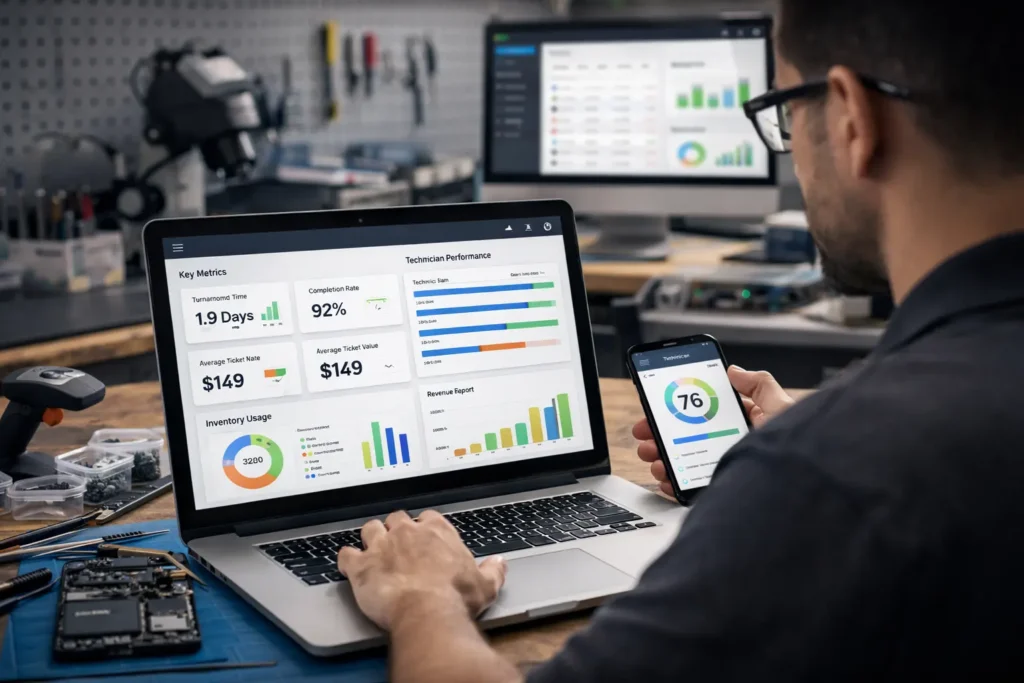 Repair shops should track metrics such as repair turnaround time, average repair ticket value, technician productivity, parts inventory usage, repeat customer rate, and service profitability.